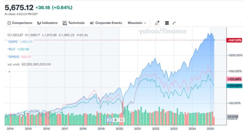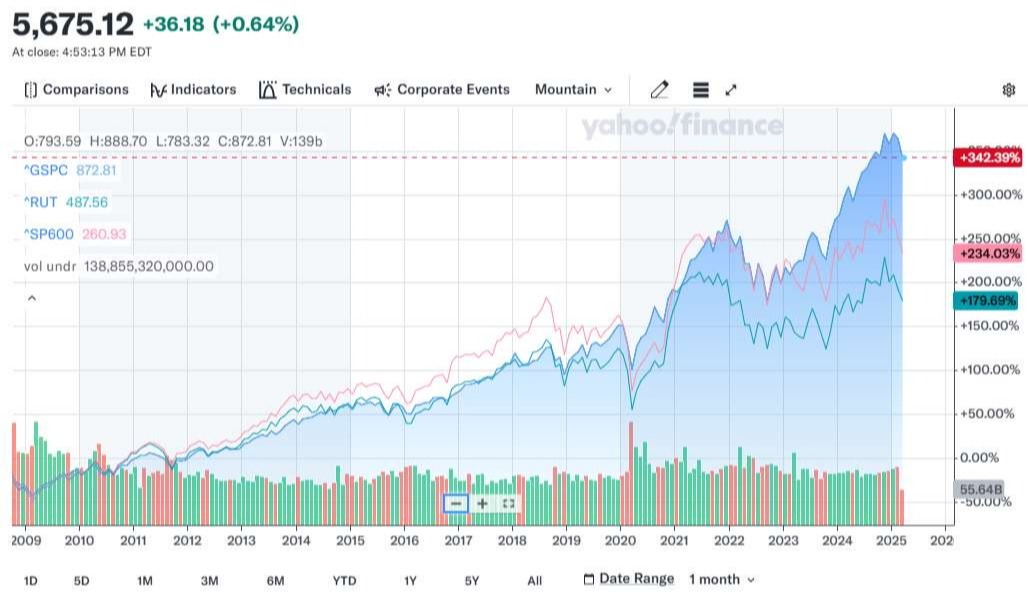 They are even down this year, almost 10%, which you can also see in this chart (as of 3/17/25 close). BLUE for the S&P 500 Large Cap Index, PINK for the S&P 600 Small Cap Index, and GREEN for the Russell 2000 Small Cap Index: